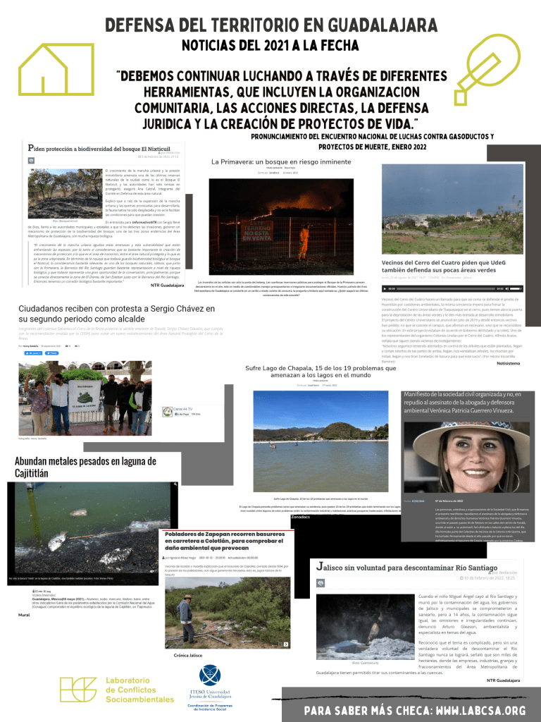 Pero también, es reconocer que nosotros como personas que vivimos en las ciudades también tenemos lugares sagrados por la importancia que tiene para la vida, como lo es el Bosque de la Primavera , Nixticuil, los cerros del 4 y de la reina, el lago de Chapala y Cajititlán que están siendo destruidos por intereses inmobiliarios y contaminados por la empresas y nuestras acciones; que estamos afectando cañadas y pasos por culpa de los lugares donde vamos a tirar nuestros desechos como Picahos, Matatlán y Laureles, y que este año asesinaron a Verónica Guerrero, días antes ella denuncio amenazas de muerte por hacer frente a la operación de vertedero de Matatlán junto a otro grupos de personas. Y esto son algunos ejemplos de lo que paso en poco más de un año en Jalisco en temas ambientales y que que esta siendo defendido por pocas personas.
