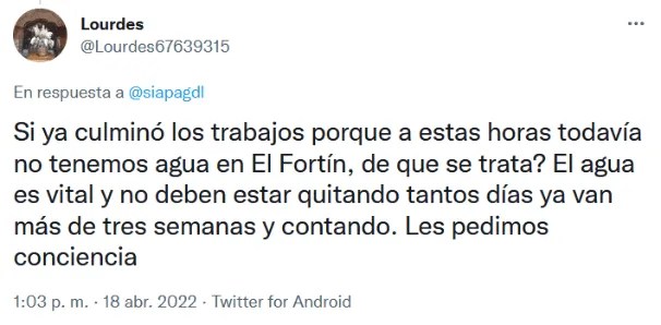 “Si ya culminó los trabajos porque a estas horas todavía no tenemos agua en El Fortín, de que se trata? El agua es vital y no deben estar quitando tantos días ya van más de tres semanas y contando. Les pedimos conciencia”, señaló otra usuaria.
