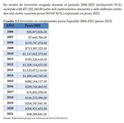 Según el documento, entre 2006 y 2021, se invirtieron más de 8 mil 547 millones de pesos, sólo en la construcción de la presa «El Zapotillo», que hasta el momento no ha podido ponerse en marcha ante el conflicto por la inundación de comunidades, problema que quedaría resuelto con el nuevo proyecto.