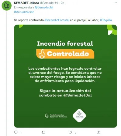 A las 10:30, la Semadet detalló que ya estaba controlado el fuego, sin embargo, minutos después se informó que se activó la alerta atmosférica en Tequila y Amatitán por los rezagos y humo que dejó el incendio en la zona de La Labor.