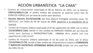 Cuando el fraccionamiento La Cima recibió su licencia de urbanización en 2005, en tiempos del alcalde priista Arturo Zamora Jiménez, el predio de la cañada se reconocía como espacio verde; sin embargo, en 2009, la administración del panista Juan Sánchez Aldana autorizó un cambio para que el predio se clasificara como espacio de infraestructura urbana, y en 2014, con el exalcalde priista Héctor Robles Peiro, se modificó nuevamente el proyecto para darle un uso de suelo de comercios y servicios intensidad media, a pesar de tratarse de un predio con características forestales y cauces de agua que forma parte de la zona de amortiguamiento del bosque El Nixticuil.