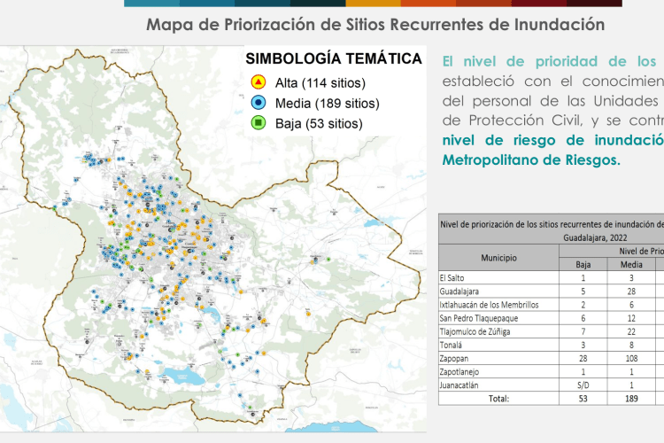 Según el mapa, hay 356 sitios recurrentes de inundación en los nueve municipios del AMG, de los cuales 35 fueron detectados a partir del temporal 2021 y representan un incremento de 11 por ciento con respecto a los 321 que se tenían identificados anteriormente.