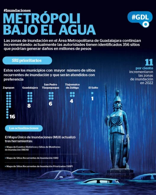 “En total, se identificaron 356 sitios con recurrencia en la inundación, 35 sitios más que en 2021 (lo que representa un incremento de 11 por ciento), siendo los municipios con mayor número de sitios recurrentes de inundación Zapopan (16), Guadalajara (8), San Pedro Tlaquepaque (6), Tlajomulco de Zúñiga (4) y El Salto (1). Estos son los sitios que tendrán prioridad en la atención por su recurrencia”, dice la actualización del Mapa Único de Inundaciones (MUI).