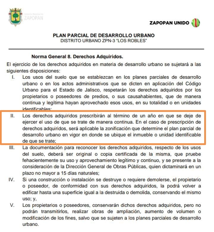La norma general 8 señala que «los derechos adquiridos prescribirán al término de un año en que se deje de ejercer el uso de que se trate de manera continua», por lo que el derecho de La Cima a desarrollar comercios en la cañada del bosque prescribió desde 2015 y aplica el uso de suelo vigente en el plan parcial de desarrollo urbano, que es para la conservación ecológica del área.