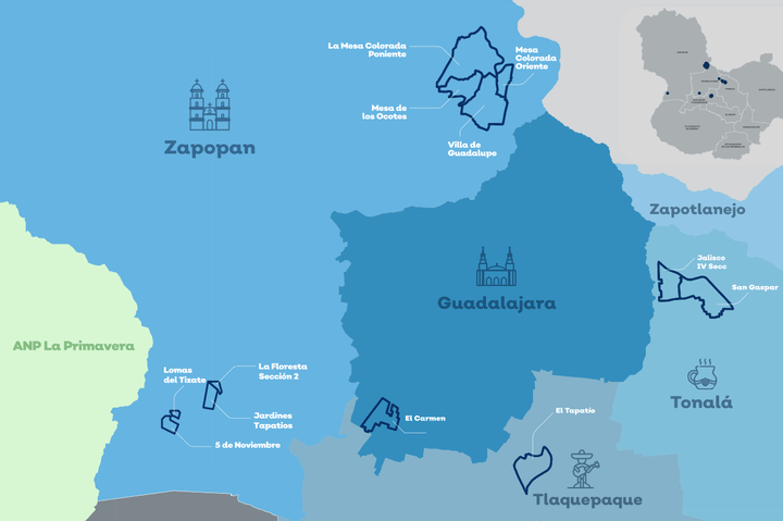 Zapopan La Mesa Colorada Poniente Mesa Colorada Oriente Mesa de los Ocotes Villa de Guadalupe 5 de Noviembre Jardines Tapatíos La Floresta sección 2 Lomas del Tizate