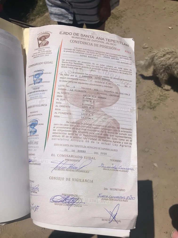 Con el ejido estuvo César Arvizu de la Procuraduría Agraria, el tesorero del ejido, las personas que nos vendieron y un licenciado del ejido; llegamos a un acuerdo. El ejido tiene la documentación para presentarla y demostrar que los documentos y terrenos donde vivíamos estaban bien fundamentados por las autoridades de Zapopan, que eran para asentamiento humano y estaban en regla.