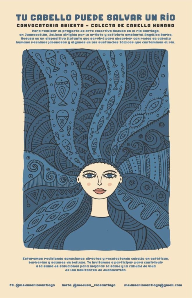 El colectivo artístico “Medusa” creó un dispositivo flotante que absorberá, a través de redes de cabello humano, residuos jabonosos y algunas sustancias tóxicas que rodean el Río Santiago en la sección que atraviesa el municipio de Juanacatlán en Jalisco.