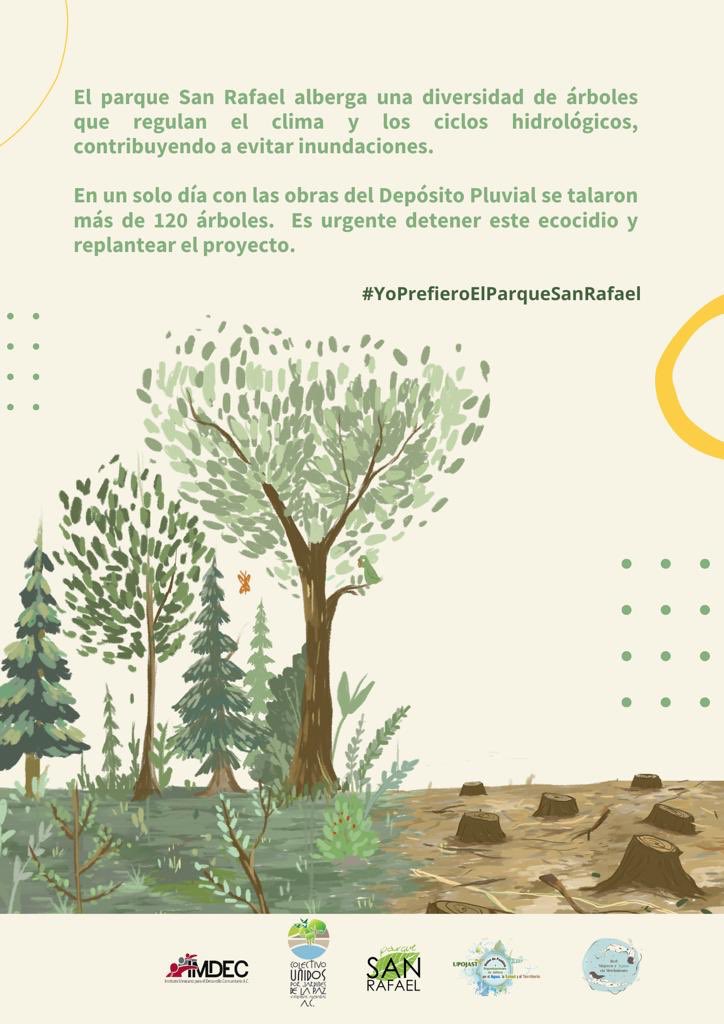 “Esta es una campaña que busca visibilizar la importancia de los parques de la ciudad y su biodiversidad, su riqueza natural, pero también está encaminada a hacer un llamado al Gobierno de Jalisco y al Sistema Intermunicipal de Agua Potable y Alcantarillado (SIAPA) para que replanteen este proyecto del depósito pluvial que se quiere construir en el Parque San Rafael”; así lo mencionó María González Valencia integrante del Instituto Mexicano para el Desarrollo Comunitario (IMDEC).