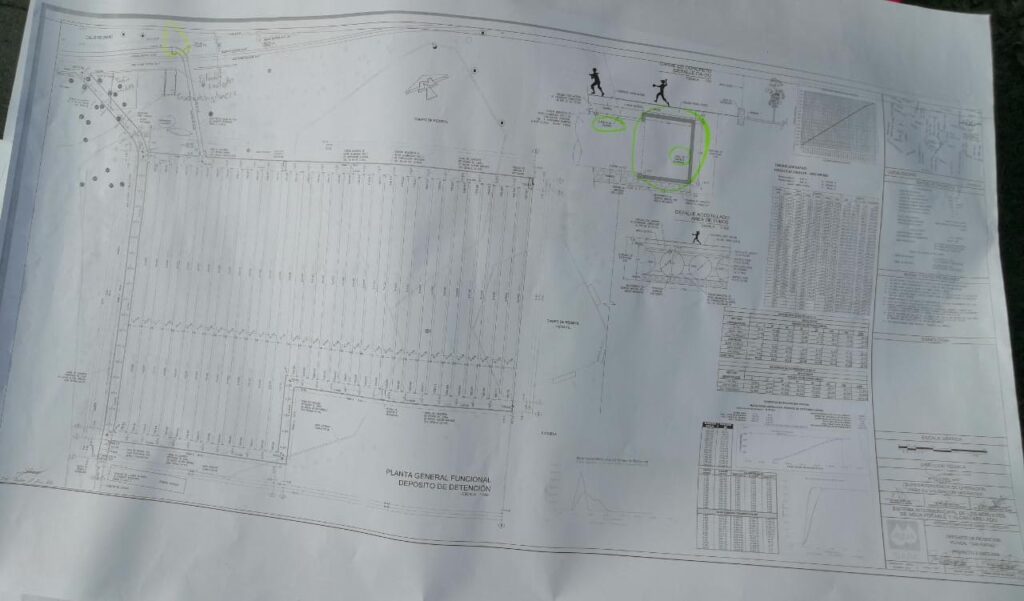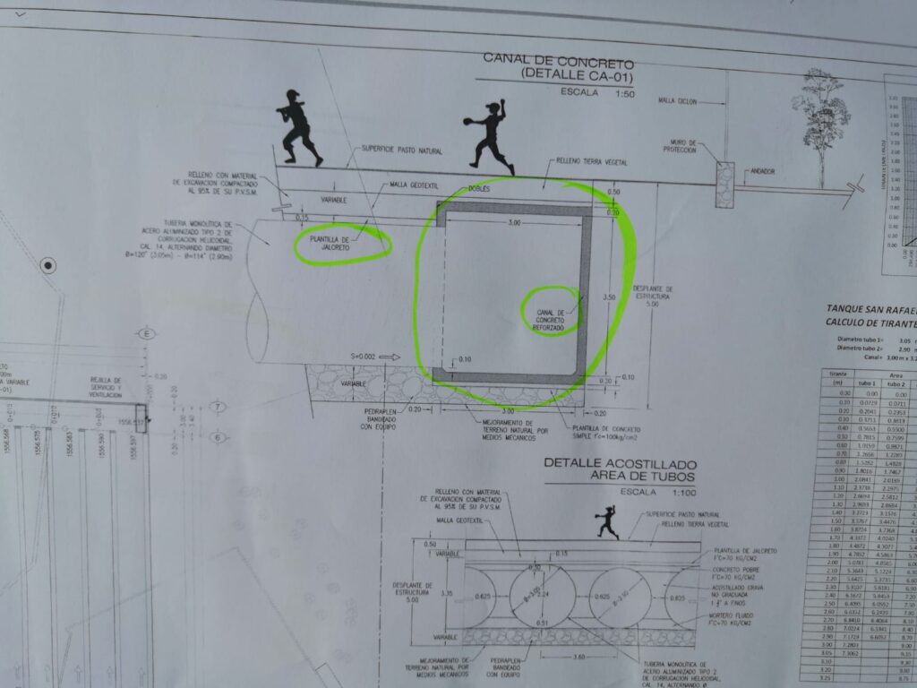«En días pasados nosotros estamos viendo cómo llegan con los trompos de cemento a empezar a impermeabilizar la obra; (el plano) habla de una plantilla de concreto simple en la parte de abajo, de aproximadamente 10 kilogramos de peso en centímetros cúbicos, esa va a ser la parte de abajo del vaso regulador o del depósito pluvial: cemento, cemento, cemento (…) ¿Ustedes creen que el agua se va a infiltrar?. Ellos dicen que no iban a poner concreto, y en los mapas y en la parte técnica aquí dice que sí lleva concreto, y son sus planos, aquí viene claramente el SIAPA, ‘Depósito Detención Pluvial San Rafael’, conseguidos por transparencia».