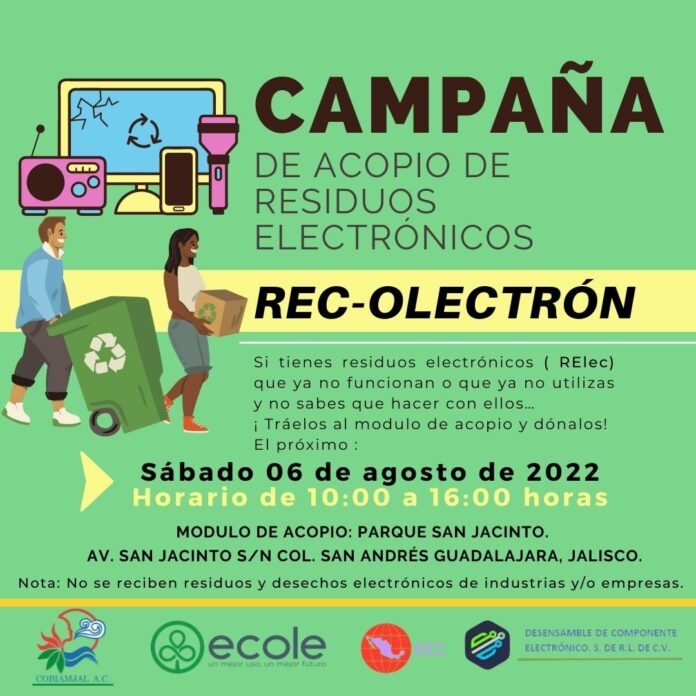 «Si tienes en casa residuos electrónicos que ya no sirven o que ya no usas, y no sabes qué hacer con ellos, te invitamos a traerlos al módulo de acopio que se instalará en el Parque de San Jacinto de la colonia San Andrés, en Guadalajara, el próximo sábado 6 de agosto, de las 10:00 de la mañana a las 04:00 de la tarde y de esta manera evitaremos que se conviertan en agentes contaminantes para nuestro planeta. No olvides participar, te esperamos, organiza el Colegio de Profesionales en Ciencias Biológicas Ambientales de Jalisco».