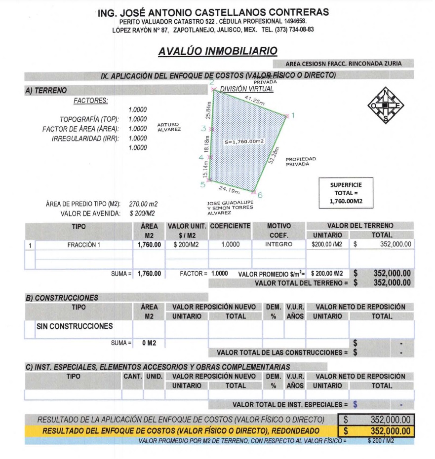 El avalúo contratado por el Gobierno Municipal el 15 de agosto, determina que el predio de mil 760 metros cuadrados tiene un valor comercial de 352 mil pesos, señalando un precio de 200 pesos por metro cuadrado, luego de comparar el costo de predios rústicos que están en venta en Zapotlanejo.