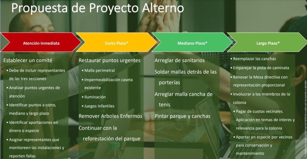 La tarde de este lunes, habitantes de la colonia Altamira se reunieron con autoridades y regidores del Ayuntamiento de Zapopan y finalmente rechazaron la entrega de la concesión privada del parque, por lo que propusieron dos escenarios a definir en una futura reunión el 26 de septiembre: que el área verde regrese a la administración municipal o que pase en comodato a la organización vecinal para hacerse cargo de forma comunitaria del parque público.