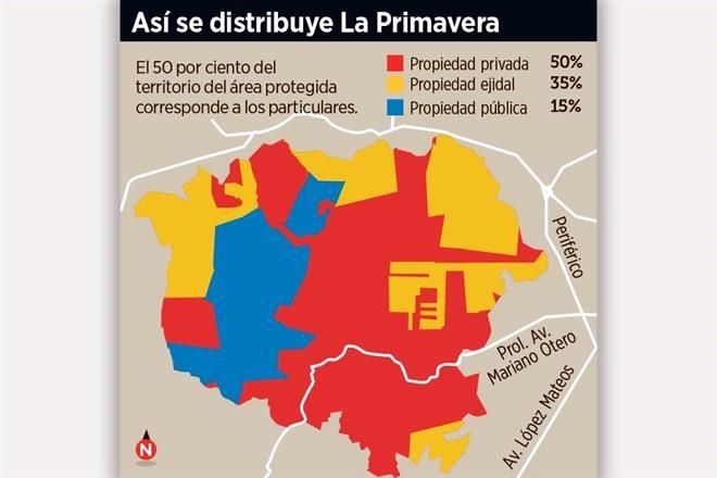 Es decir, el bosque La Primavera cuenta con más de 2 mil ejidatarios y una cantidad no estimada de propietarios privados, a pesar de que el 50 por ciento del territorio del área protegida corresponde a este régimen de propiedad, un 35 por ciento es ejidal y sólo 15 por ciento es público, del Gobierno de Jalisco.