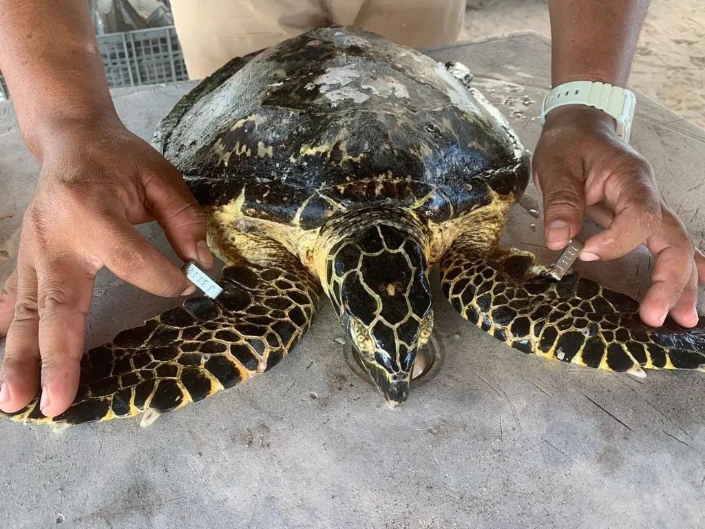 Cabo Corrientes, Jalisco. 08 de noviembre de 2022. (Letra Fría).- La semana pasada, el Campamento Tortuguero Mayto, ubicado en Cabo Corrientes, recibió de manos de un joven buzo, llamado Óscar Peña, una tortuga carey que presentaba placas de identificación distintas a las de la zona.