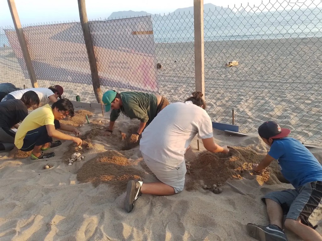 Como primer paso, lo que se hace es limpiar el área de arriba para poder quitar la arena seca y llegar hasta la arena mojada, para esto se cava con las manos un hoyo de aproximadamente 45 cm, que es la profundidad a la que se entierran los huevos.