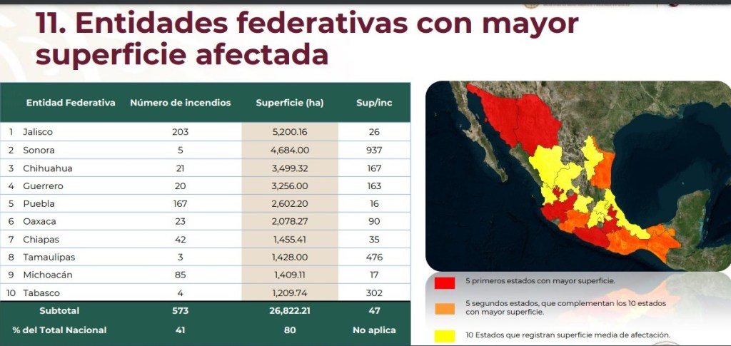 Sin embargo, Jalisco encabeza las entidades con mayor superficie afectada. Después le siguen Sonora, Chihuahua, Guerrero, Puebla, Oaxaca, Chiapas, Tamaulipas, Michoacán y Tabasco, que representan el 80% del total nacional.