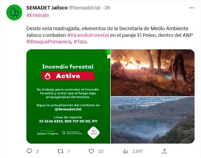 A través de redes sociales, la Semadet reportó un nuevo incendio en progreso en el Área Natural Protegida (ANP) Bosque La Primavera. A las 7:44 horas, la dependencia detallaba que los elementos se encontraban combatiendo las llamas, aunque sin dar mayores detalles sobre el avance de las labores.