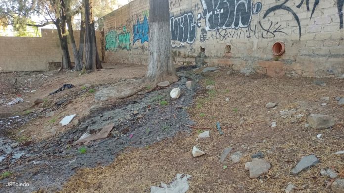 Los tubos de la barda que delimita el desarrollo con la unidad es por dónde se vierte el agua de drenaje, originalmente estas salidas son para el agua de lluvia, pero desde hace semanas salen aguas negras que ya corren por todo el interior del espacio deportivo.