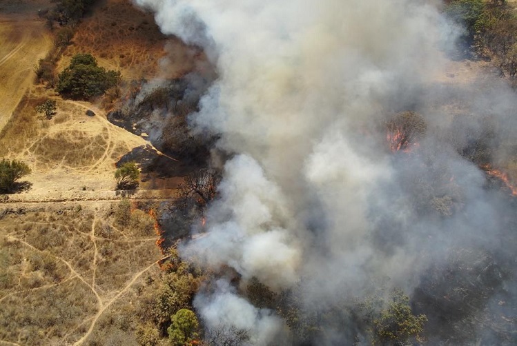 Desde diferentes frentes, bomberos zapopanos tratan de controlar el fuego en el paraje Los Coyotes dentro del Bosque La Primavera; en las labores también participan brigadistas de la Secretaría de Medio Ambiente y Desarrollo Territorial, de la Comisión Federal de Electricidad y del OPD Bosque La Primavera.