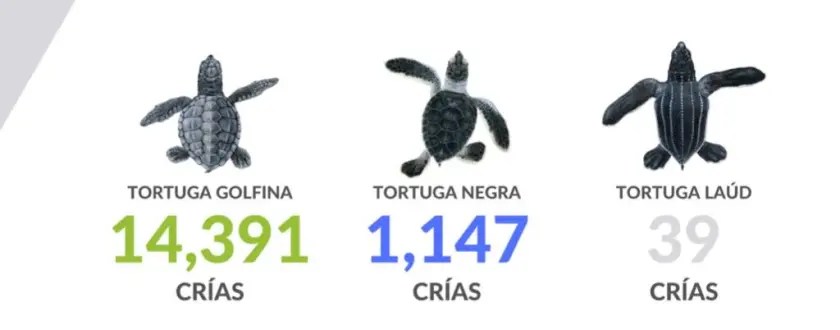 De acuerdo con el reporte, en ninguna otra temporada se había registrado un número tan alto de anidaciones de tortuga negra (Chelonia mydas) en la playa Mayto, llegando al récord histórico de 34 nidos colectados y resguardados en los corral de incubación. Actualmente, han eclosionado 32 nidos con un 67% de éxito de eclosión.