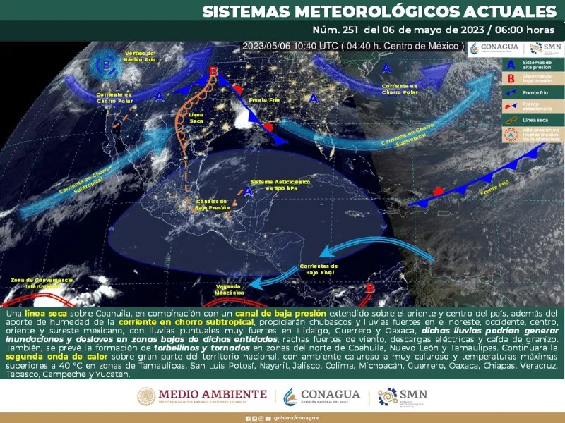 Este sábado 6 de mayo de 2023, el Servicio Meteorológico Nacional (SMN) pronostica que la segunda onda de calor sobre gran parte del territorio nacional, con ambiente caluroso a muy caluroso y temperaturas máximas superiores a 40 °C, afectará zonas de Tamaulipas, San Luis Potosí, Nayarit, Jalisco, Colima, Michoacán, Guerrero, Oaxaca, Chiapas, Veracruz, Tabasco, Campeche y Yucatán.