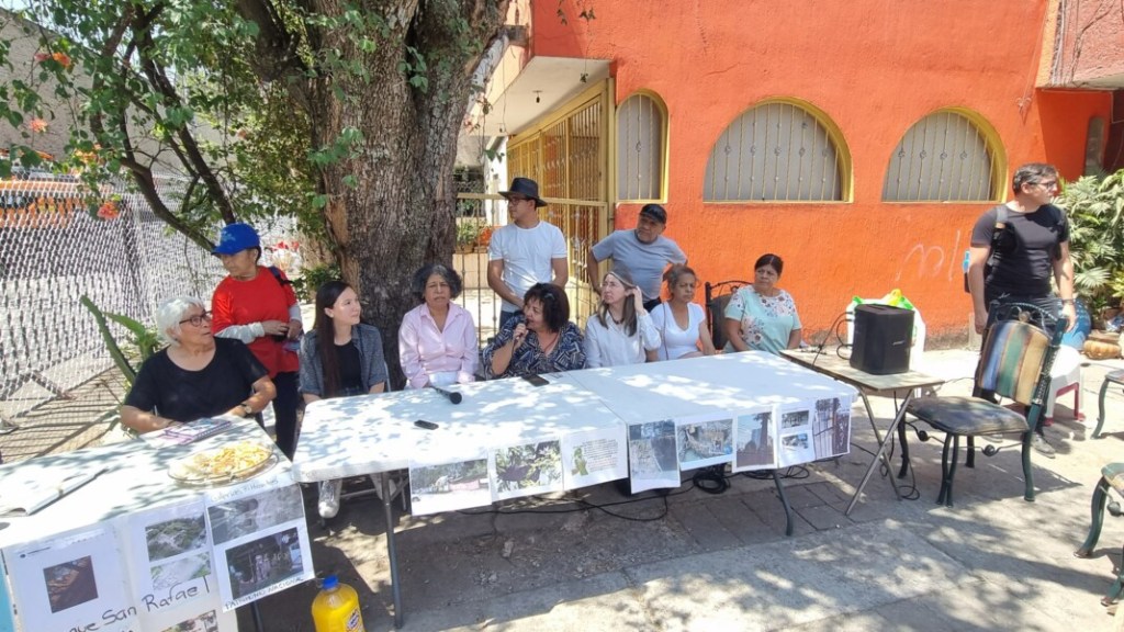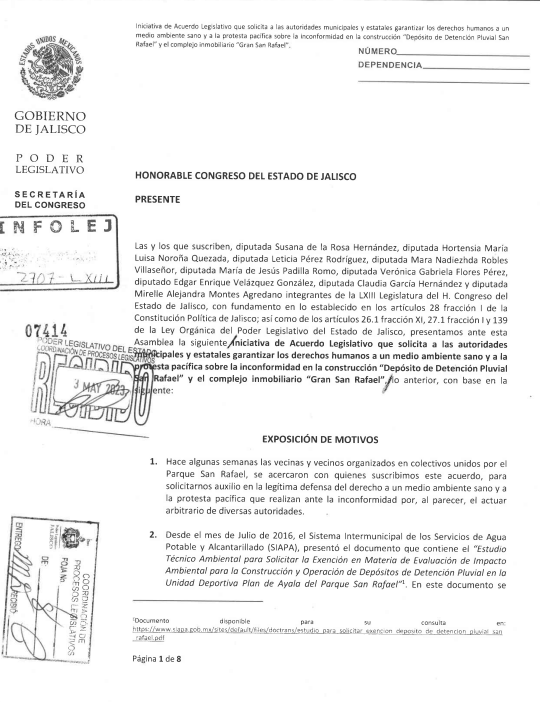 El colectivo Vecinos Unidos por Jardines de la Paz lleva una lucha contra el Ayuntamiento tapatío desde 2017 por tres temas: el cambio de usos de suelo en el parque, la construcción del desarrollo inmobiliario “Gran San Rafael” por la empresa Grupo San Carlos, y la construcción del vaso colector de aguas pluviales “San Rafael” por SIAPA.