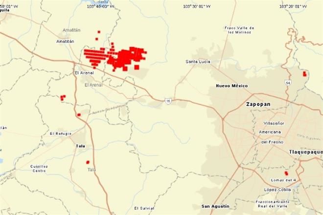 - La Nasa reveló el mapa de incendios, donde se aprecia cómo el incendio en El Arenal se extendió hasta Zapopan. Foto: Especial
