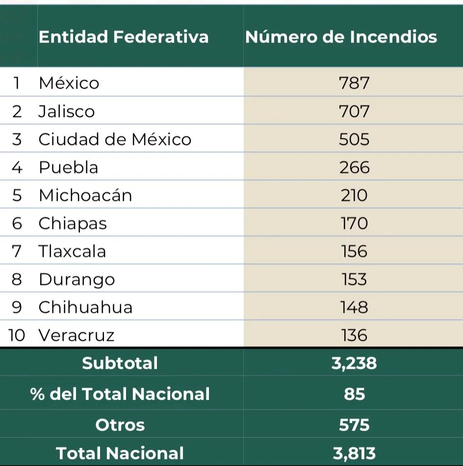 Jalisco ocupa el segundo lugar a nivel nacional en número de incendios, con un total de 707 y se ubica en primer lugar con la mayor superficie afectada con 71 mil 062.23 hectárea, esto es aproximadamente 8 mil veces más que las afectadas durante todo el año 2022.