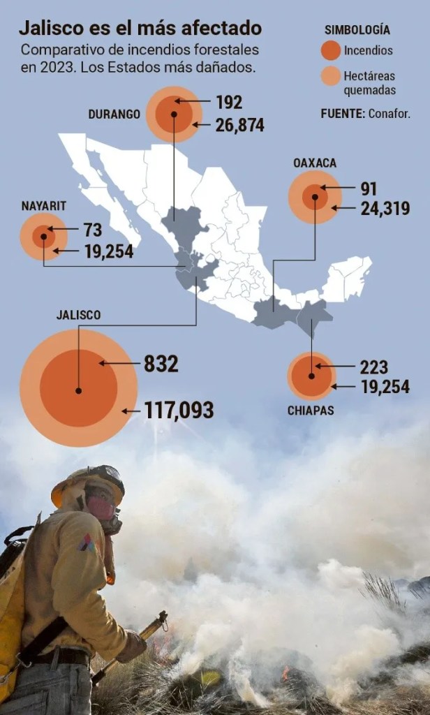 El último reporte de la Comisión Nacional Forestal revela que el Estado encabeza a nivel nacional las quemas en los bosques, por lo que suman 832 incendios y 117 mil 093 hectáreas dañadas (esta superficie afectada equivale a cuatro veces el bosque de La Primavera). Es el año con más afectaciones en la presente administración estatal.