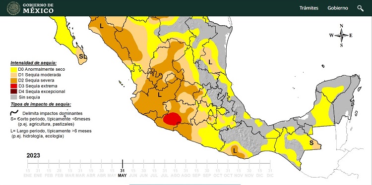 El monitor de sequía de México, que opera el Servicio Meteorológico Nacional (SMN), señala que Jalisco tiene 123 de 125 municipios sumidos en una sequía severa, mientras solo dos, Puerto Vallarta y Quitupán, registran “sequía moderada”. De este modo, la entidad aporta 32 por ciento de los 382 municipios del país afectados por la escasez severa de humedad.