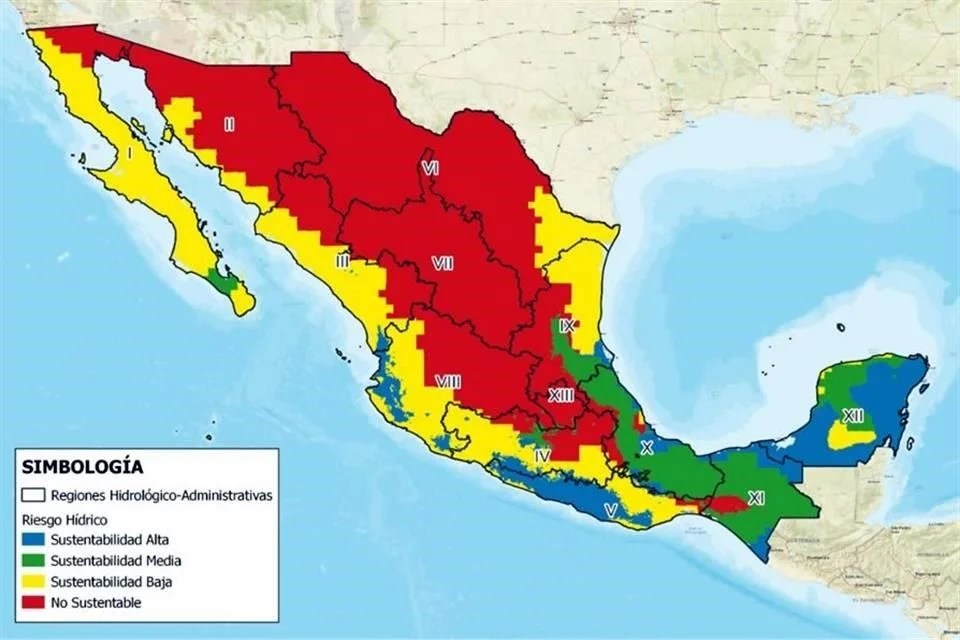 El IMTA desarrolló un mapa que se divide en cuatro categorías: las regiones donde las prácticas de gestión de agua han llevado a una gestión hídrica no sustentable aparecen en rojo, poco sustentable en amarillo, medianamente en verde y altamente sustentable en azul. La mayor parte del País se tiñe de rojo y amarillo.