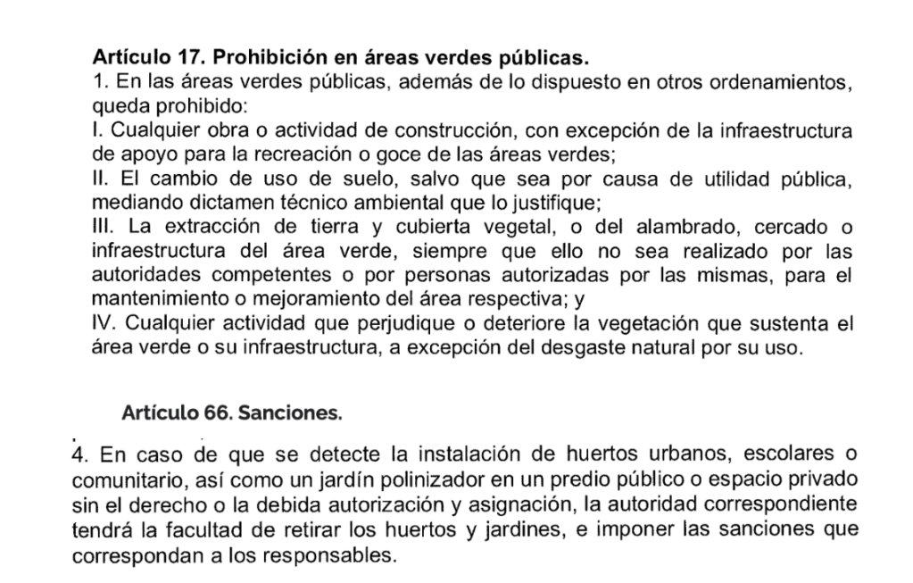 Expresaron primordialmente su preocupación ante el artículo 17 que prohíbe la construcción de huertos sin la autorización de las autoridades competentes o personas autorizadas para el mantenimiento o mejoramiento de las áreas verdes; también manifestaron su descontento por el artículo 66 que expone las sanciones para quienes “alteren” el orden público.