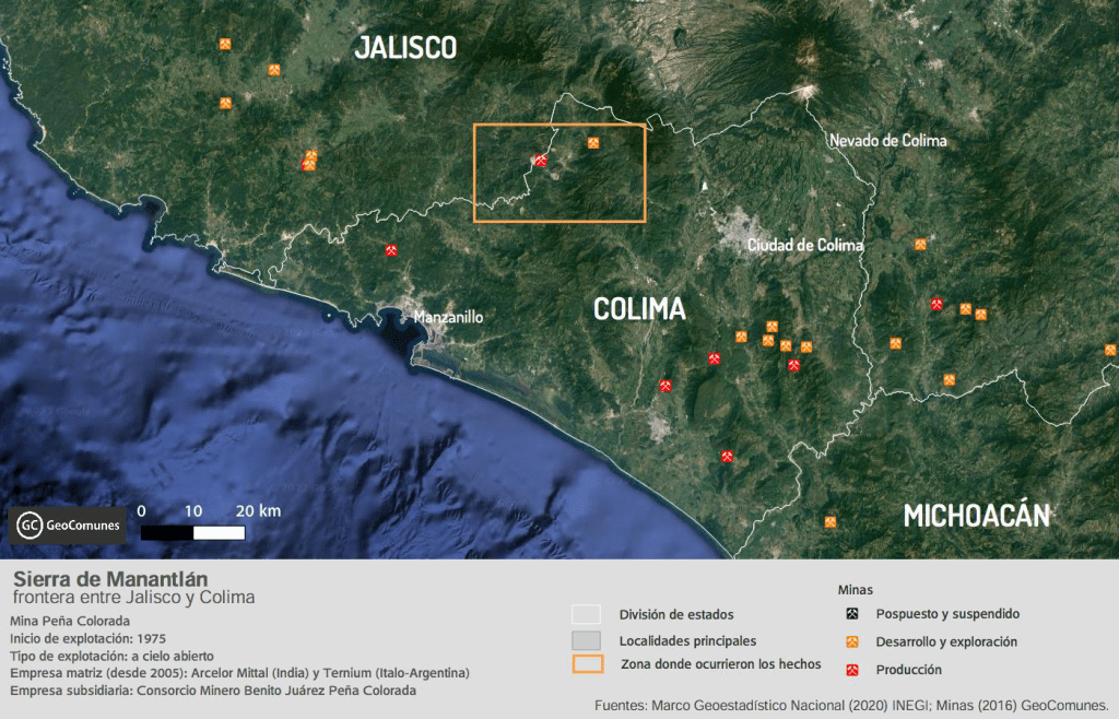 Los ejidatarios de Ayotitlán luchaban por el reconocimiento de su territorio cuando, en 1975, el gobierno mexicano creó el Consorcio Minero Benito Juárez Peña Colorada. La paraestatal abrió la mina Peña Colorada y con ello inauguró la explotación de hierro en la Sierra de Manantlán, específicamente en terrenos ubicados en municipios que son vecinos, pero pertenecen a dos estados diferentes: Cuautitlán de García Barragán, Jalisco, y Minatitlán, Colima.