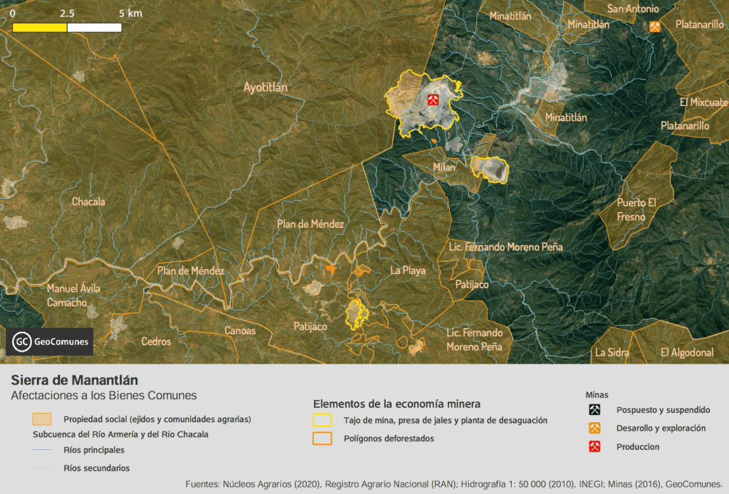 Para este trabajo periodístico, GeoComunes —colectivo que acompaña a pueblos, comunidades, barrios, colonias u organizaciones de base que requieran de la producción de mapas para la defensa del territorio— realizó mapas que muestran las concesiones mineras que el Estado mexicano ha entregado en la región. Ahí es posible observar que casi todas las tierras del ejido Ayotitlán han sido concesionadas para la minería.