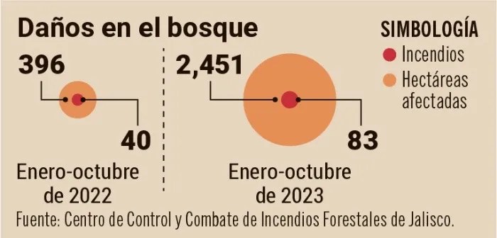 En este año, el Bosque de La Primavera, cuyo día se conmemoró el pasado 27 de octubre, registró 83 incendios forestales, lo que representó una afectación de dos mil 451 hectáreas. Eso significa el doble de los 40 documentados en 2022, según estadísticas del Centro de Control y Combate de Incendios Forestales de Jalisco.