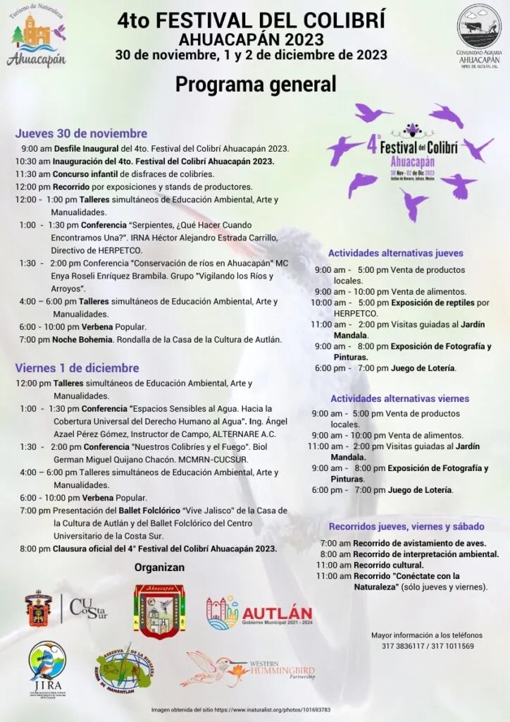 Autlán de Navarro, Jalisco.- Está listo el programa del cuarto Festival del Colibrí de Ahuacapán, una actividad impulsada por la gestión de la comunidad, las instituciones académicas y el gobierno municipal de Autlán que permiten que el colibrí sea el mensajero de la riqueza cultural y ambiental del ejido, dijo en entrevista para Letra Fría, Sarahy Contreras Martínez, jefa del Laboratorio de Zoología, del departamento de Ecología y Recursos Naturales del Centro Universitario de la Costa Sur y promotora del proyecto.