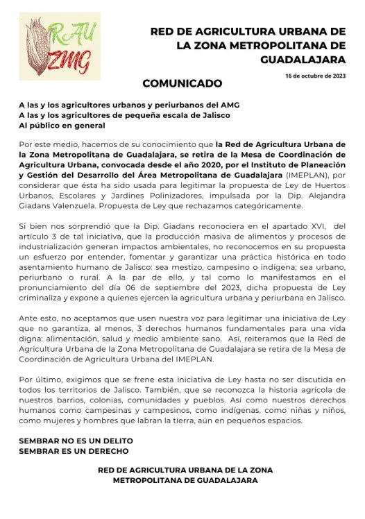 Posteriormente a mediados de octubre la Red de Agricultura Urbana a través de un comunicado dio a conocer que dejaba de formar parte de la Mesa de Coordinación de Agricultura Urbana, convocada por el Instituto de Planeación y Gestión del Desarrollo del Área Metropolitana de Guadalajara (IMEPLAN).