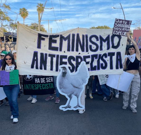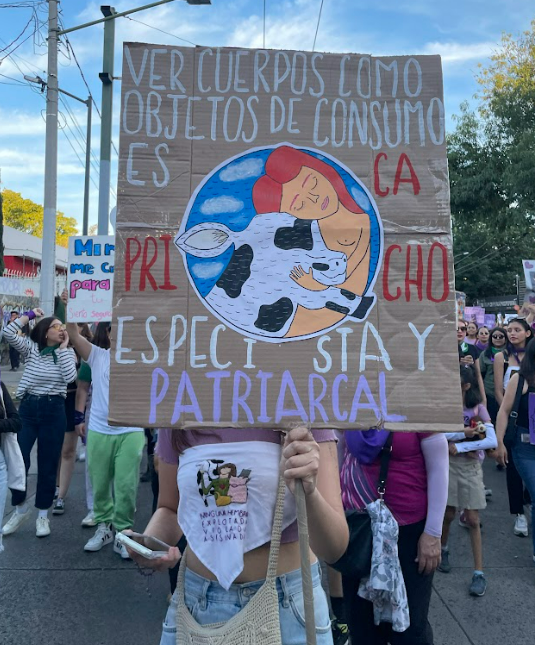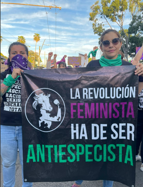 En la marcha del #8M de Guadalajara, el colectivo feminista antiespecista “Guadalajara Climate Save” salió a las calles para hacer un llamado a la necesidad de un feminismo interseccional y antiespecista que reconozca que “la explotación, la opresión y la violencia capitalista patriarcal, trasciende especies”.