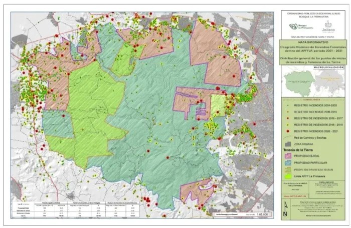 De acuerdo con el siguiente mapa del Organismo Público Descentralizado (OPD) Bosque La Primavera, más de la mitad del bosque corresponde a propiedad particular.