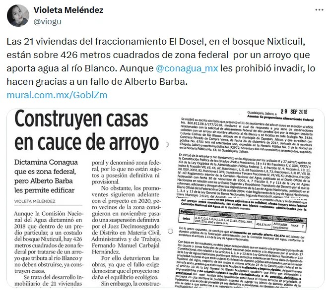 La cuenta, así como varios usuarios que se han sumado al reporte vía redes sociales, se está haciendo una exigencia publica tanto al Gobierno de Zapopan, como a la Conagua y a la Procuraduría Federal de Protección al Ambiente (Profepa) para actúen y clausuren las obras del fraccionamiento “El Dosel” antes de que ocurran más daños al área protegida del bosque Nixticuil y para que eviten poner más vidas humanas en riesgo.