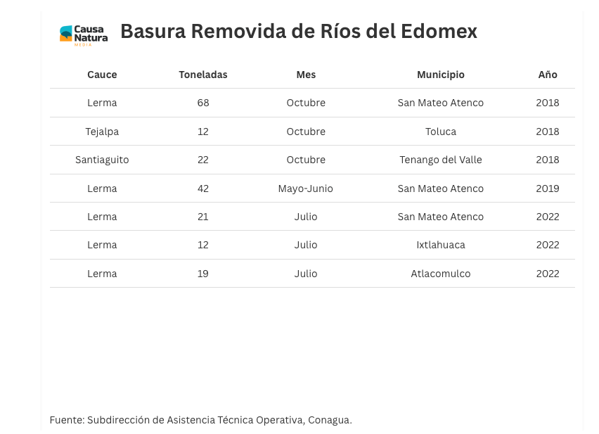 Causa Natura Media solicitó a la Comisión Nacional del Agua (Conagua) la relación de basura removida de la Cuenca Aguas del Valle de México. Ésta contestó que entre el 2018 y el 2024 se han retirado 431 mil 817 toneladas de basura, el equivalente a las toneladas de concreto que se necesitan para construir cuatro estadios Azteca.