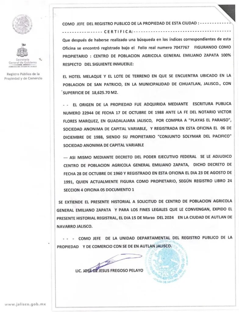 Por ejemplo, el historial registral del Registro Público de la Propiedad donde especifica que el Centro de población agrícola General Emiliano Zapata es propietario al 100 por ciento de:
