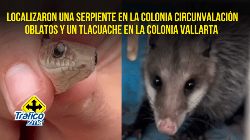 Una serpiente fue encontrada sobre la vía pública en la colonia Circunvalación Oblatos de Guadalajara; casi simultáneamente, un tlacuache fue reportado dentro de un domicilio en la colonia Vallarta del mismo municipio.
