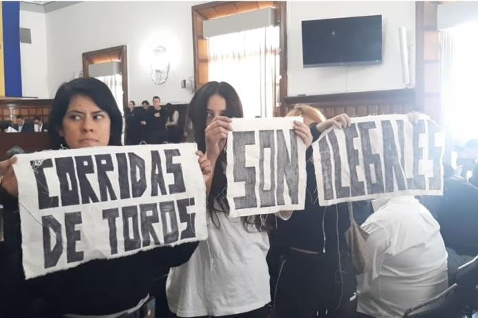 Ya con el salón inusualmente abarrotado, se cerró la puerta al iniciar la sesión, sin embargo ya en desarrollo las activistas sacaron mantas contra las corridas de toros.