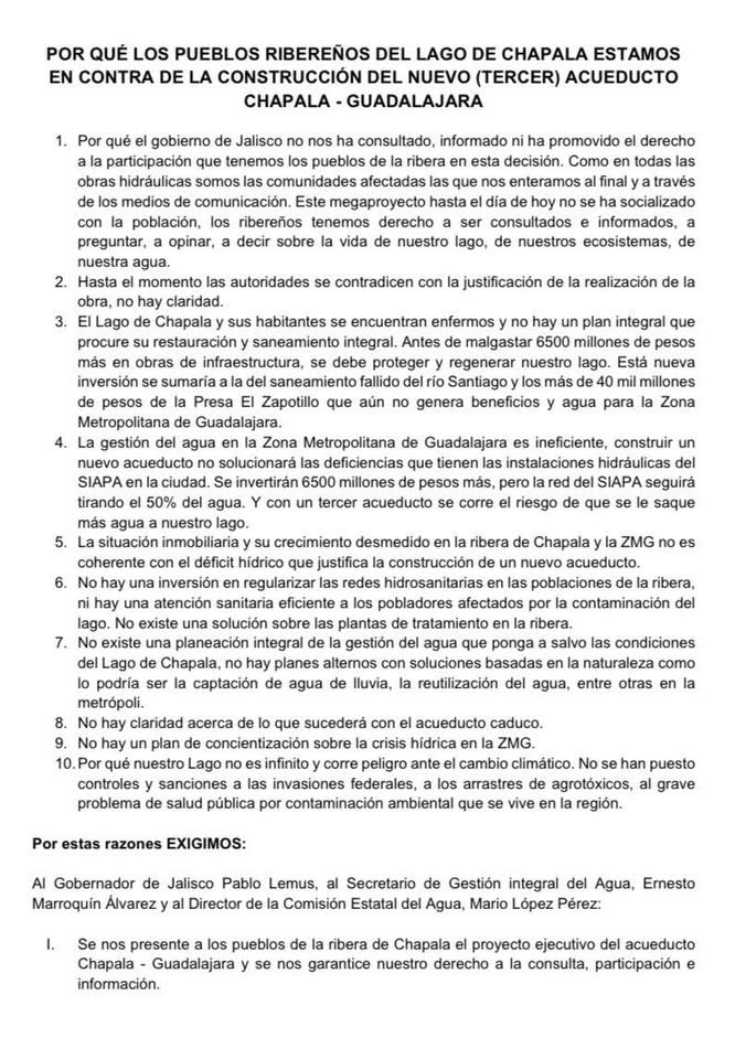 Comunicado, Frente de Pueblos de la Ribera del Lago de Chapala