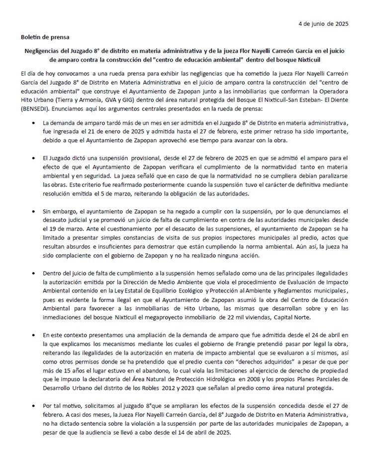 Bosque Nixticuil, Comité en defensa del Bosque Nixticuil, Comunicado