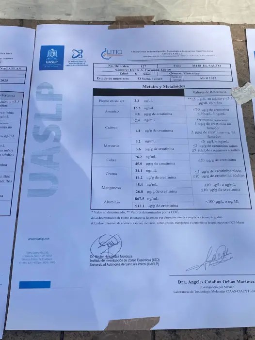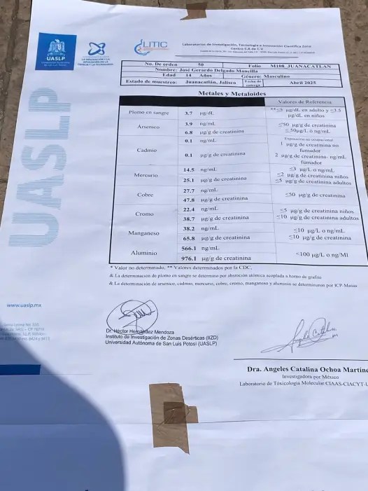 El 4 de junio de este año, la científica y profesora del Centro de Investigación Aplicada en Ambiente y Salud de la Universidad de San Luis Potosí, la Dra. Gabriela Domínguez Cortinas, entregó a la Secretaría de Salud Jalisco (SSJ), una usb con seis archivos que contienen los resultados de análisis en sangre, plasma y orina a 174 bebés, niños y adultos.
