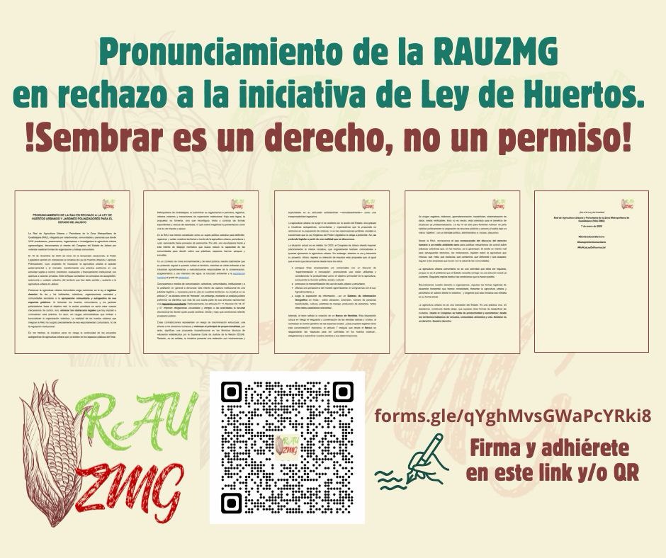 - El pronunciamiento íntegro “Pronunciamiento de la RAUZMG en rechazo a la iniciativa de Ley de Huertos: ¡Sembrar en un derecho, no un permiso!”, con opción para sumarse, se puede encontrar en: https://forms.gle/qYghMvsGWaPcYRki8