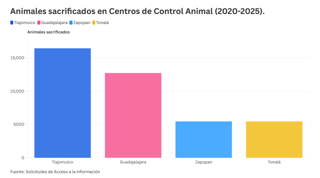 La violencia contra animales no es un hecho aislado. En el Área Metropolitana de Guadalajara (AMG), de enero a octubre de 2025, de acuerdo a diversas solicitudes de transparencia, fueron sacrificados 5 mil 470 perros y gatos. En promedio, 18 animales fueron privados de la vida cada día durante estos meses.