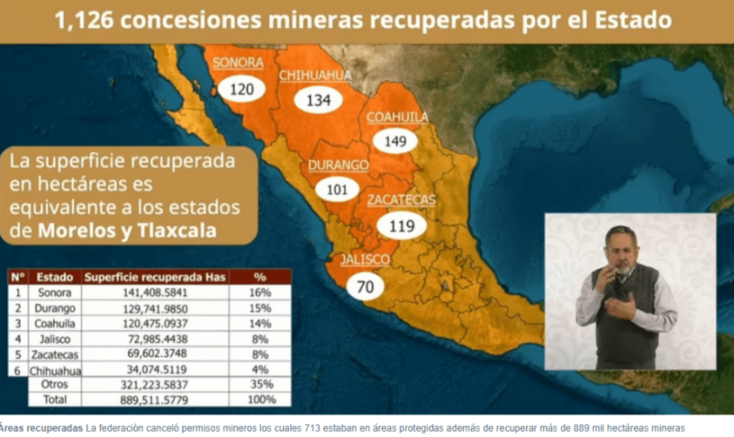 La información fue presentada en Palacio Nacional, donde funcionarios de la Secretaría de Economía detallaron que, hasta ahora, se han cancelado mil 126 concesiones mineras que en conjunto abarcan 889 mil 512 hectáreas. De ese total, 249 mil 108 hectáreas corresponden a zonas naturales que ahora quedan libres de actividad minera.